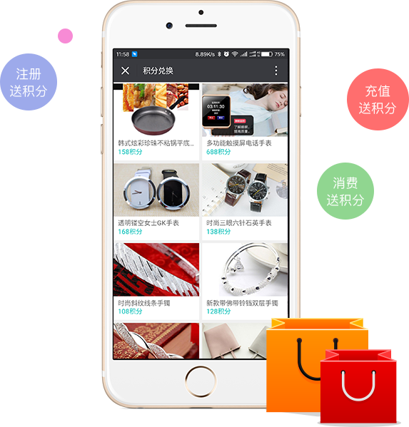 注册送积分、充值送积分、消费送积分等,积分任意兑换;
